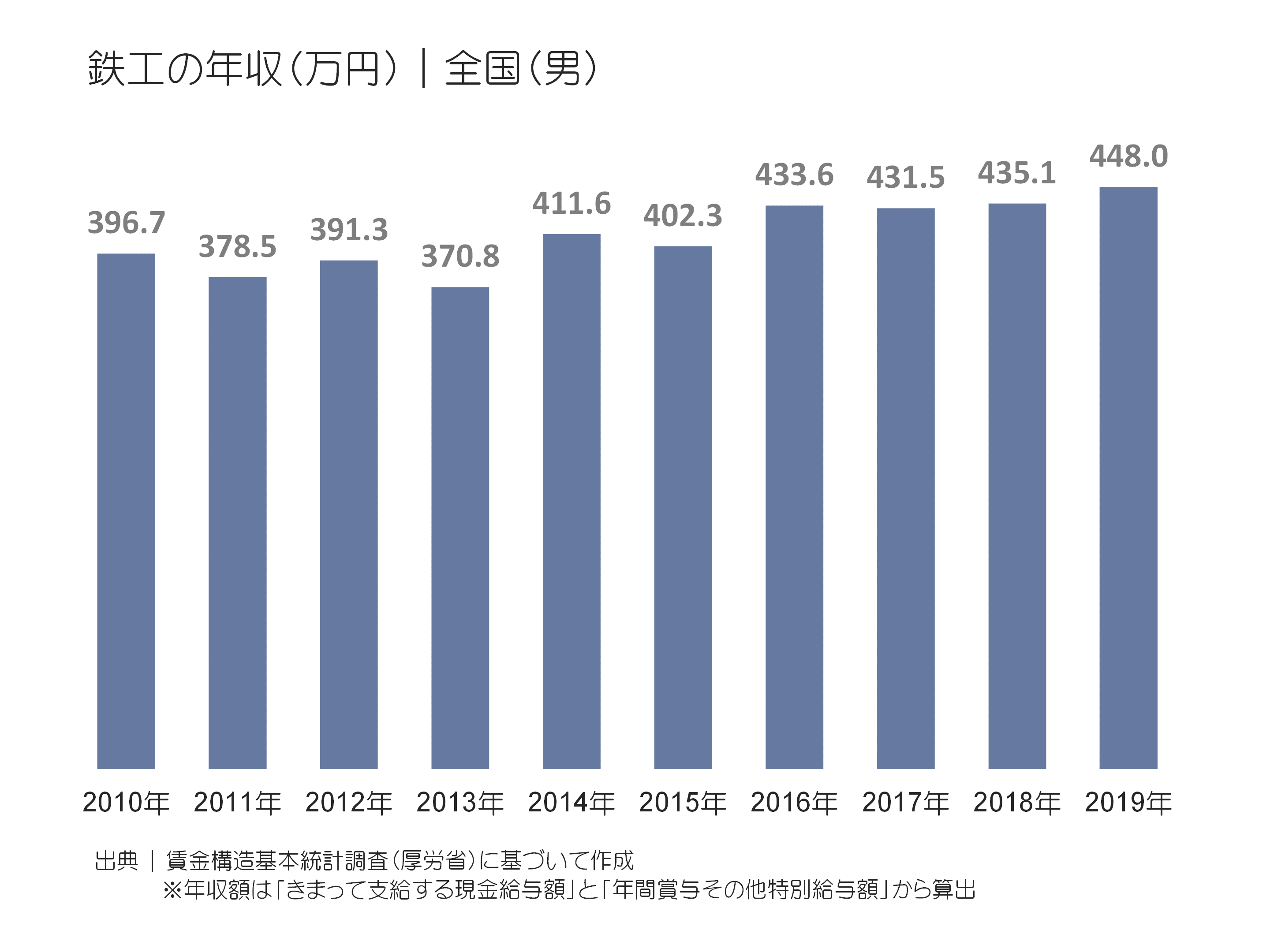同様に、全国における鉄工(男性)の年収水準を見てみると、2010年の396.7万円から2013年には370.8万円まで落ち込みましたが、その後2016年までに433.6万円の水準まで増加となりました。その後は、2017年の431.5万円、2018年の435.1万円と概ね横ばいで推移し、そこから2019年の時点では448.0万円と若干ながら増加していることが読み取れます。(下図参照)