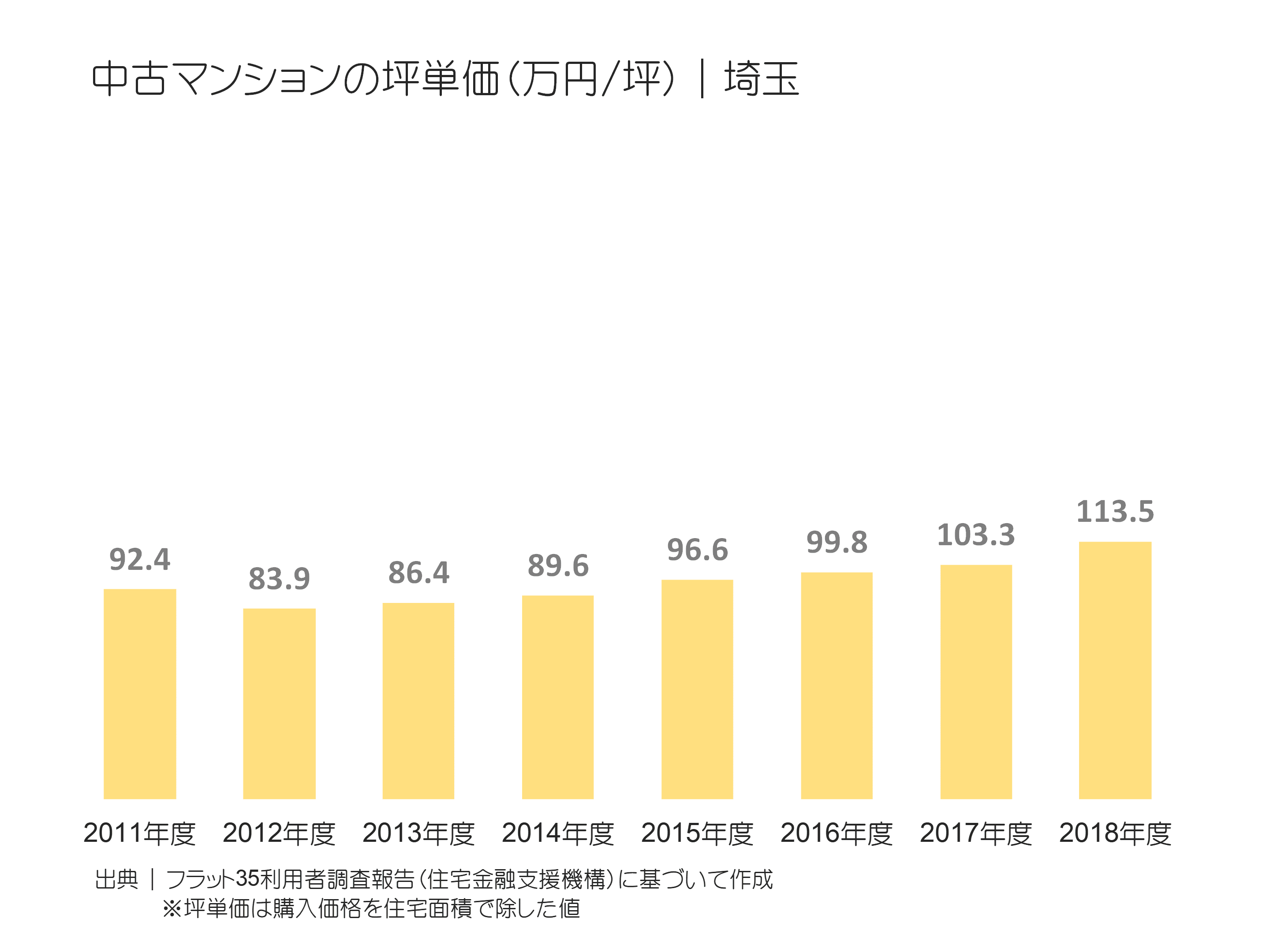 一方、埼玉における中古マンションの坪単価について、その傾向を見てみると、底である2012年度の83.9(万円/坪)から2018年度の113.5(万円/坪)まで6年連続の上昇傾向で推移しています。また、この6年間での上昇率は35.4%となっており、前述した購入価格の上昇率を上回っていることが分かります。(下図参照)