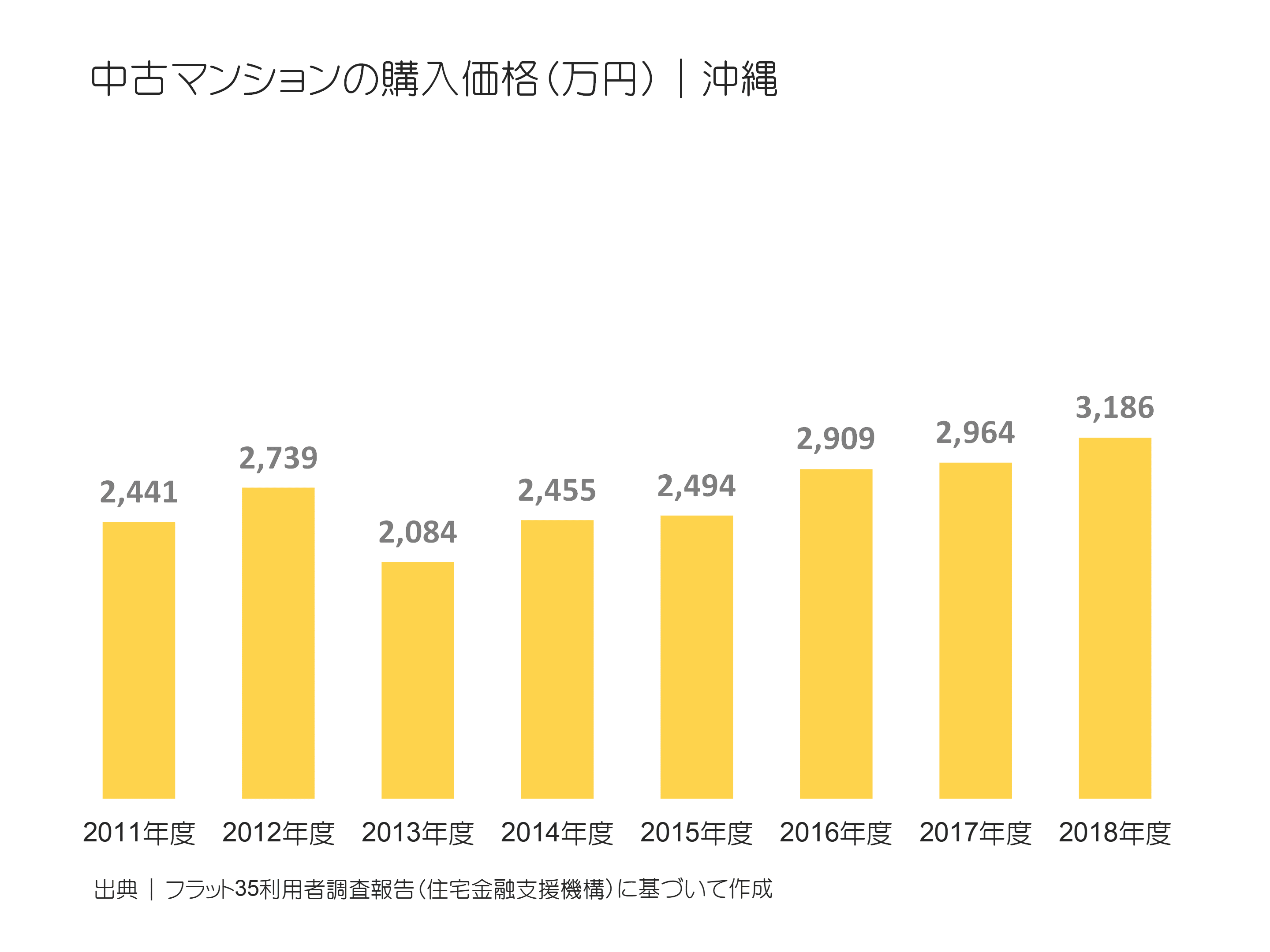 沖縄における中古マンションの購入価格について、2011年度から2018年度までの推移を見てみると、底となった2013年度の2084万円から2018年度の3186万円まで5年連続の上昇傾向で推移し、購入価格はこの5年間で約52.9%上昇していることが読み取れます。(下図参照)