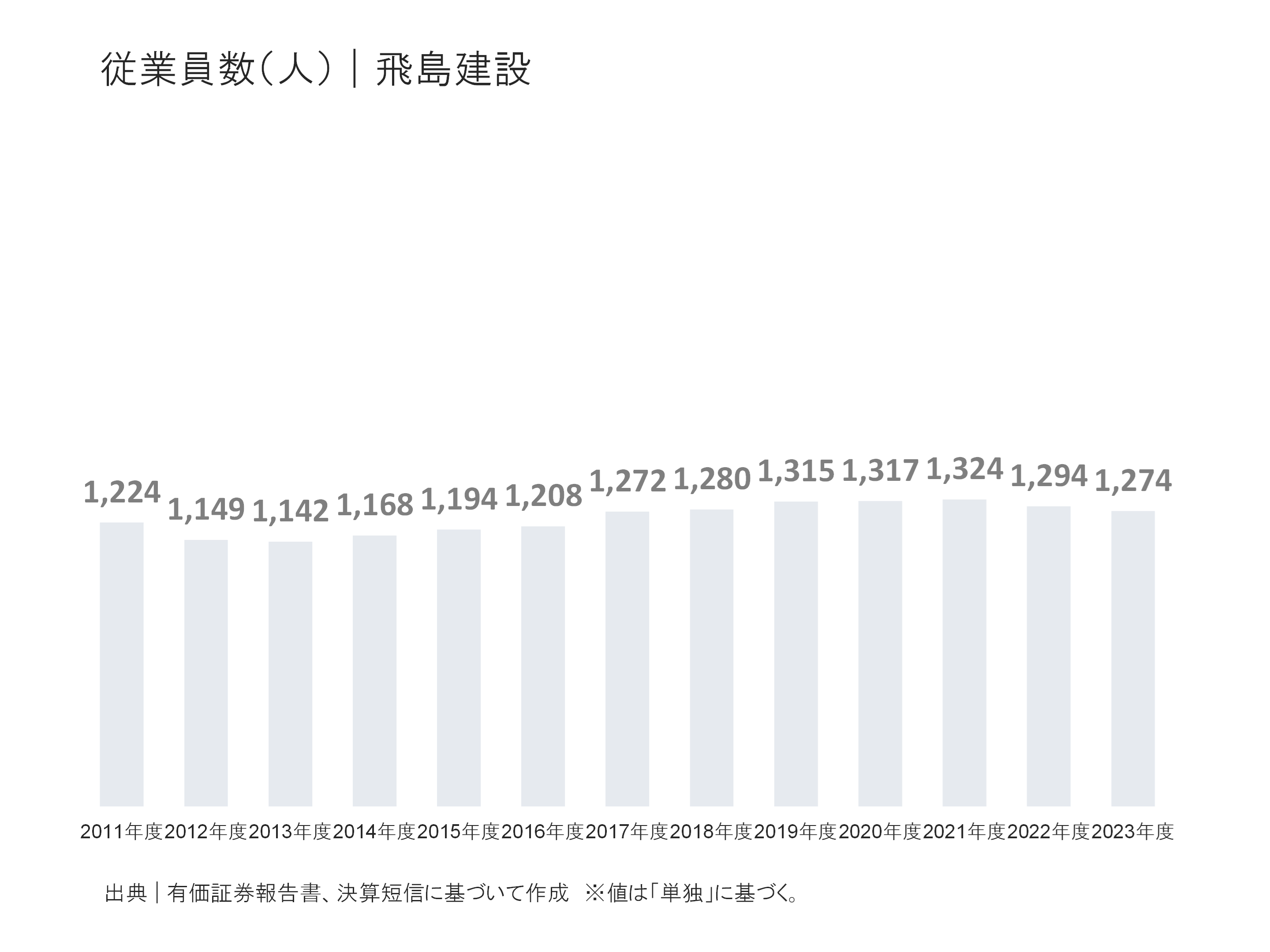 2024年度における飛島建設の従業員数は1660人でした。従業員数は2013年度の1,142人より2021年度の1,324人まで8年連続の増加傾向で推移していましたが、2022年度以降は減少し、2024年度は増加に転じていることが読み取れます。(下図参照)