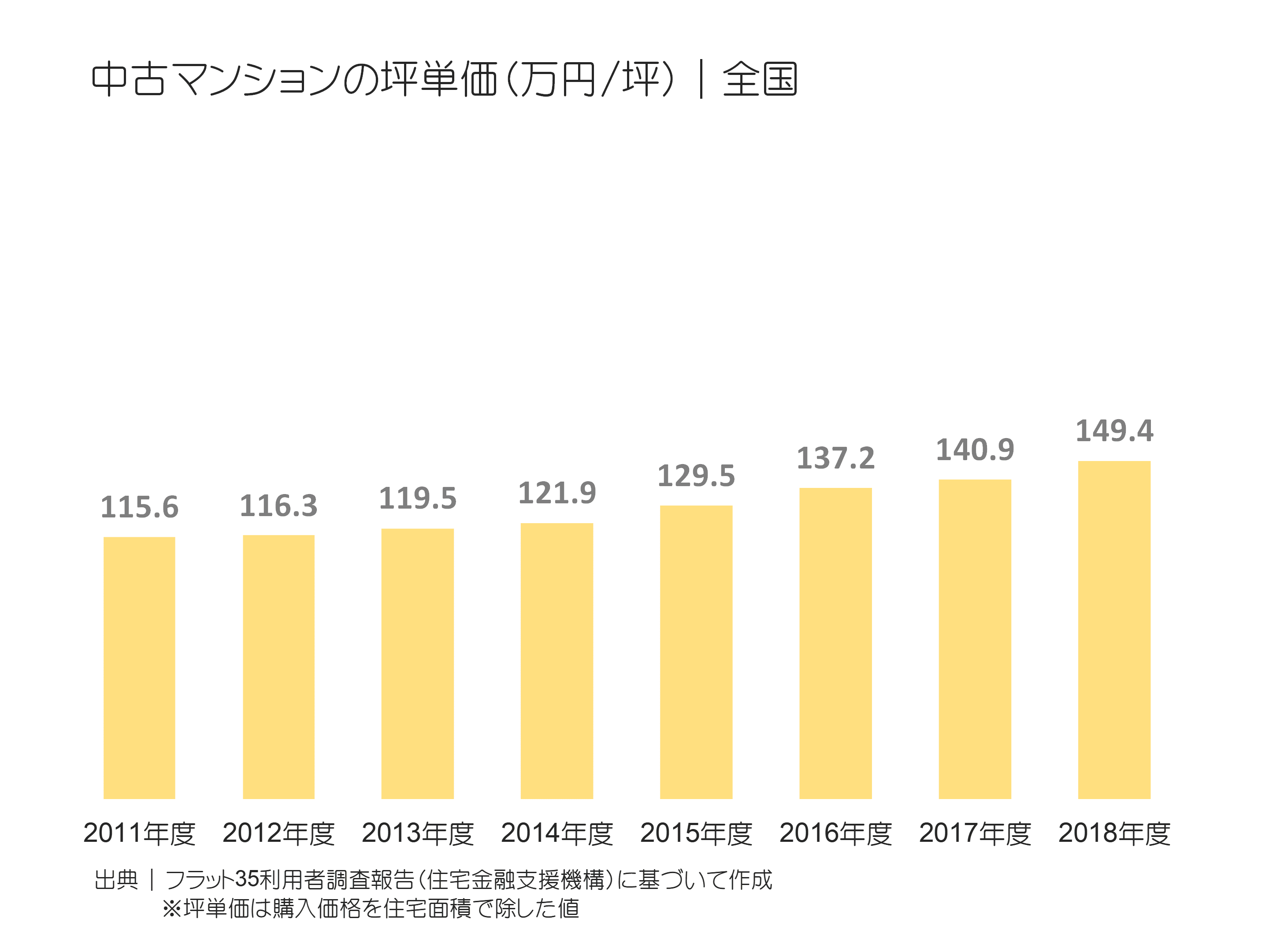 全国における中古マンションの坪単価について、その傾向を見てみると、2011年度の115.6(万円/坪)から2018年度の149.4(万円/坪)まで7年連続の上昇傾向で推移していることが分かります。また、この7年間での上昇率は29.2%となっており、前述した購入価格の上昇率を10%以上も上回っていることが分かります。(下図参照)