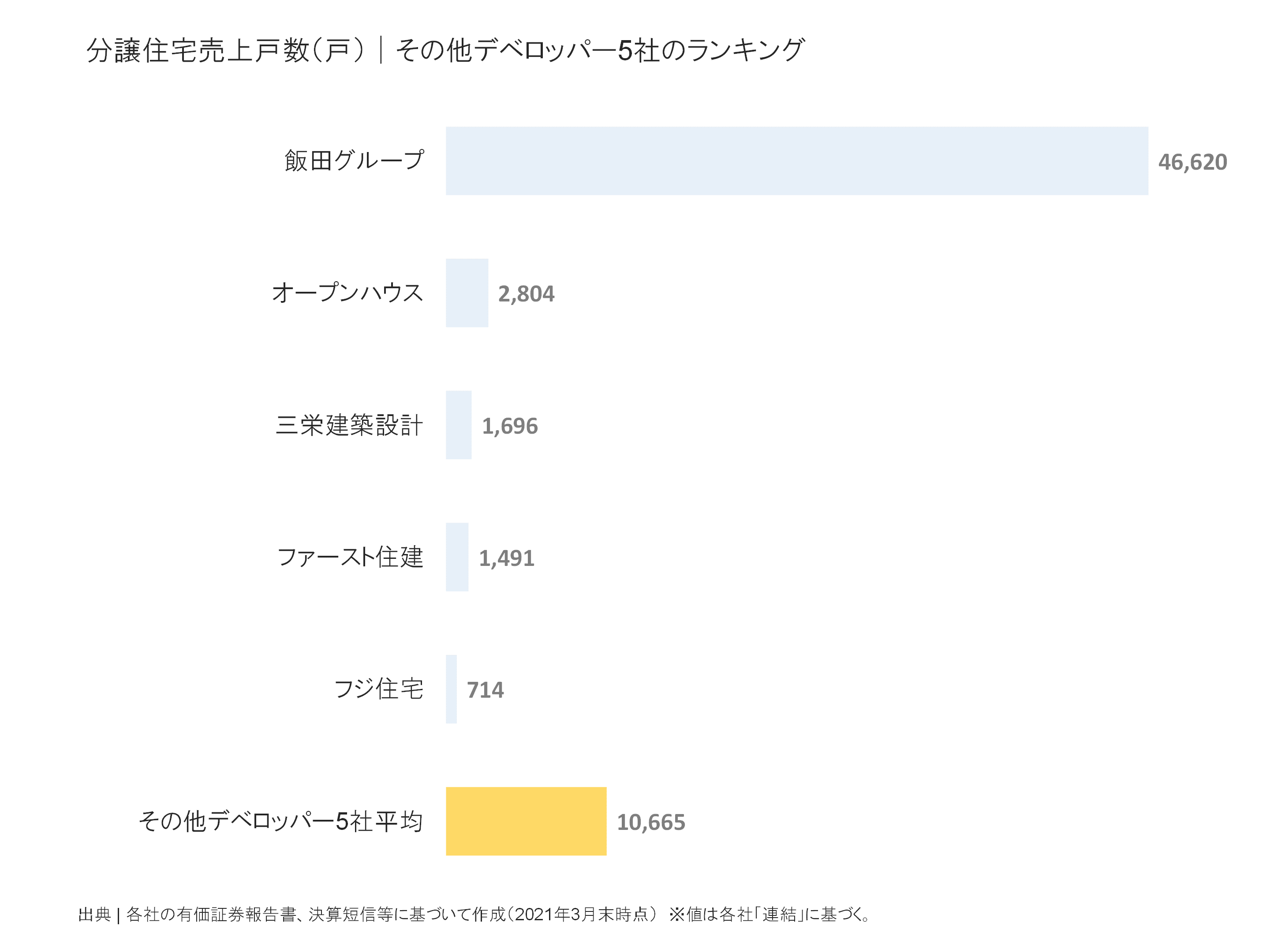 なお、その他デベロッパー5社における平均の分譲住宅売上戸数は約1万665戸となっていますが、これは顕著に高い水準となった飯田グループの影響を受けた結果であることが読み取れます。
