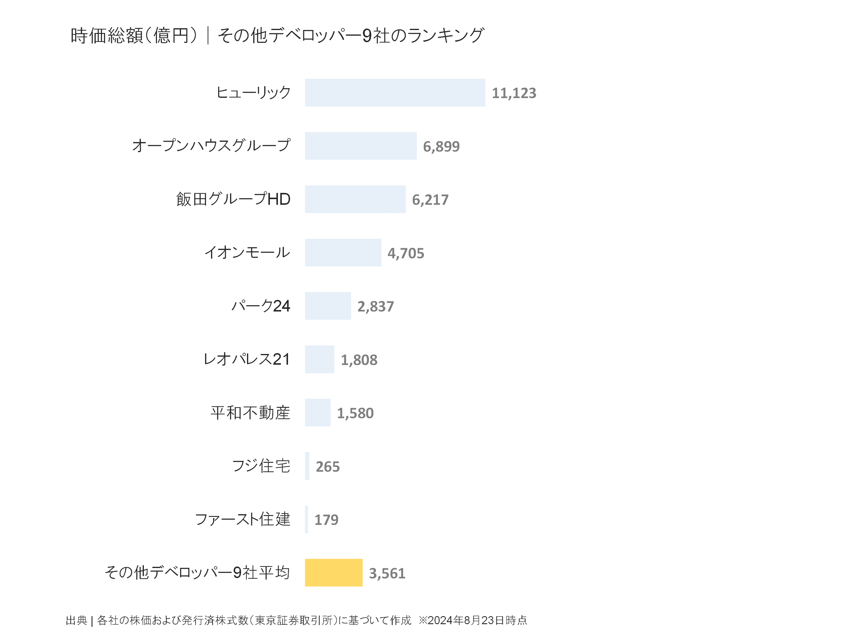 一方、時価総額の水準が最も低くなったその他デベロッパーはファースト住建で144億円となりました。フジ住宅、平和不動産、レオパレス21が250億円、1569億円、1855億円と続いています。なお、その他デベロッパー10社における平均は約3403億円と、イオンモールとパーク24の間に位置していることが分かります。