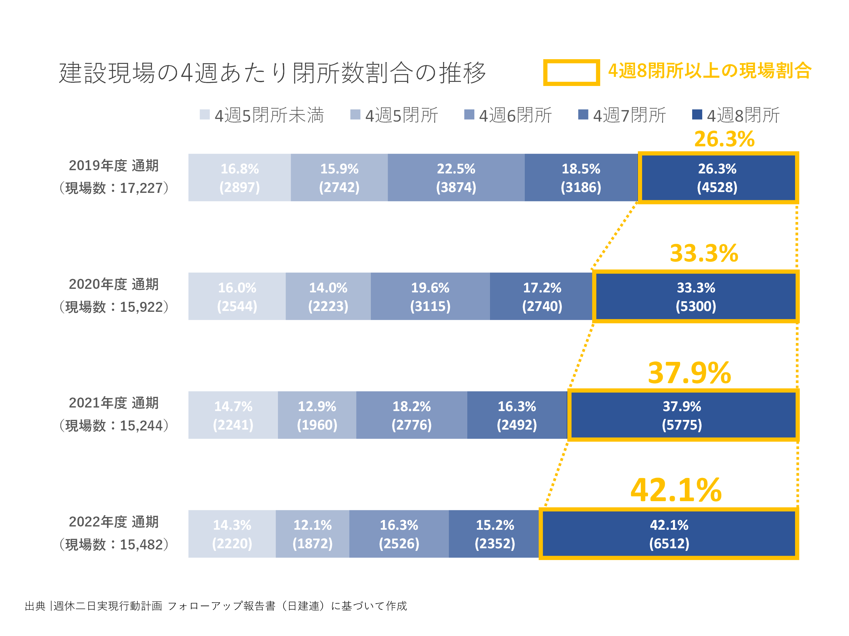 建設業の「働き方改革」は、時間外労働の罰則付き上限規制の一般則が適用される2024年4月までに、これまでの4週4閉所から4週8閉所にすることで「週休2日」の実現を目指していますが、2022年度の段階で4週8閉所の進捗割合は約42.1%と50%を切っています。(下図参照)