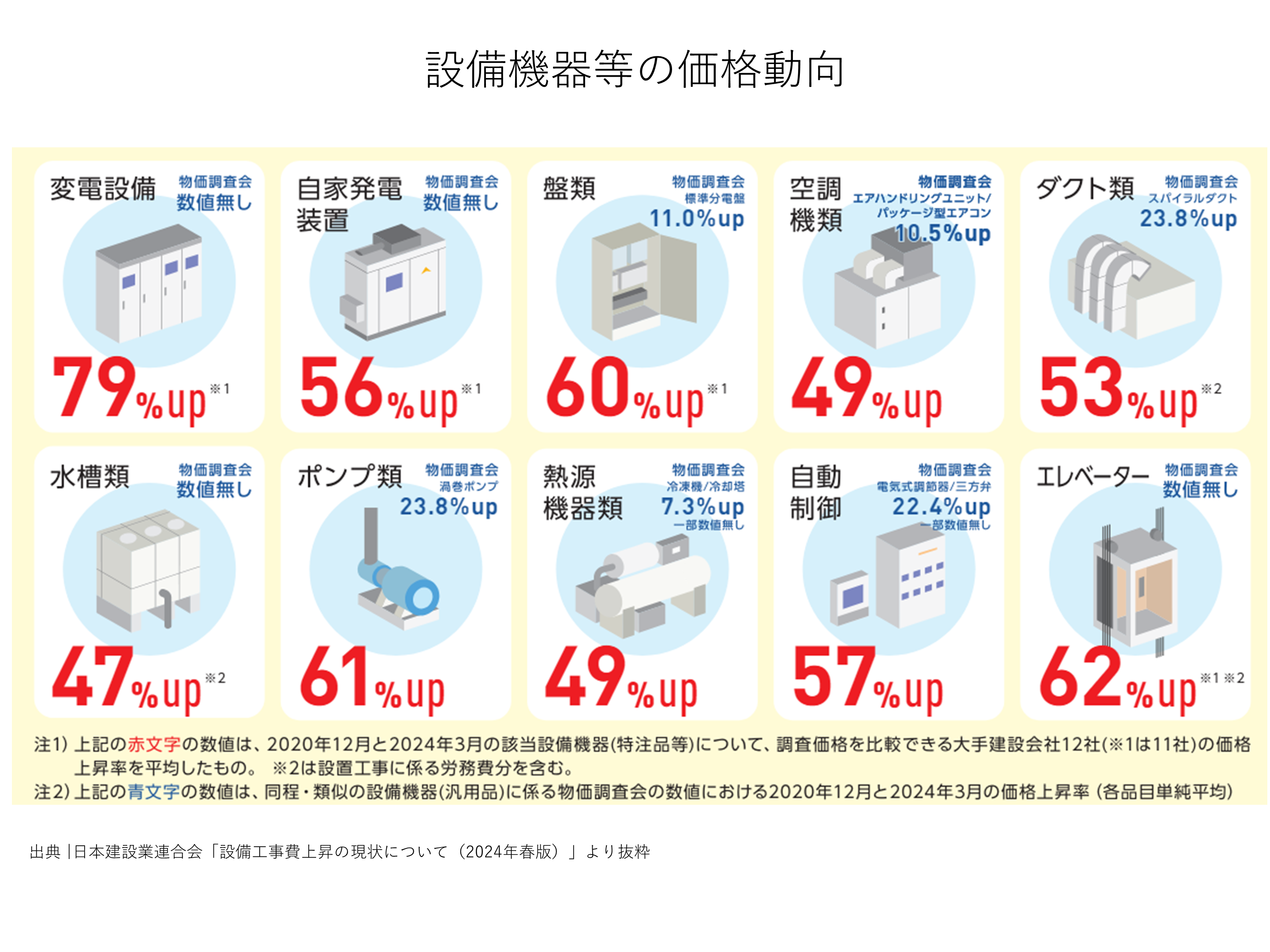 具体的に、2020年12月から2024年3月までの約3年間に、変電設備、自家発電装置や盤類といった電気設備機器の価格で約47%から79%、空調機、ダクト類、熱源機器類や自動制御といった空調設備機器の価格で49%から57%、水槽類やポンプ類といった衛生設備機器の価格で47%から61%上昇していますが、現在はさらに上昇していると考えられます。(下図参照)